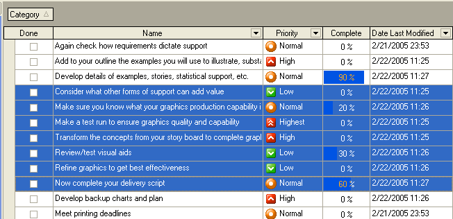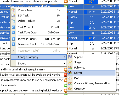 Step 1. Use the mouse or the keyboard to select all the necessary tasks from the Task List Step 2. Press the right mouse button and choose "Change Category" in a popup menu, and then select required category.