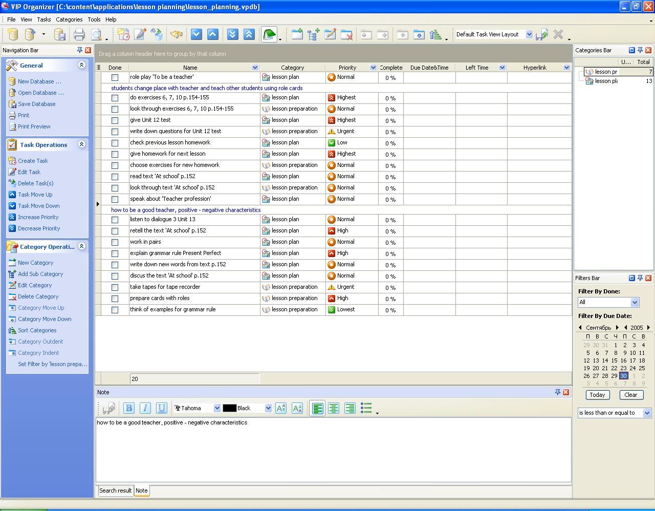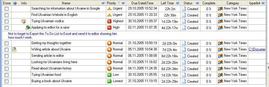It takes you 5 minutes to write down tasks in VIP Organizer, subsuming each task under category ‘New York Times’ and subcategory ‘Article about Ukraine ’. Some of these tasks like ‘To search for information about Ukraine in Google’ are important, others like ‘To try Ukrainian food’ are not. You know how important is to put the first things first, so this software’s priority tool is at your service from its ‘lowest’ to its ‘highest’ point.