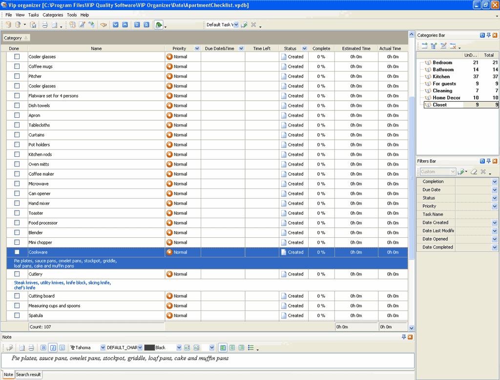 Apartment checklist is a 'to do list' template that will help you to inspect the apartment you are going to move in. Use this Apartment template to look into each corner of the apartment and find out all existing defects or non-operated equipment.