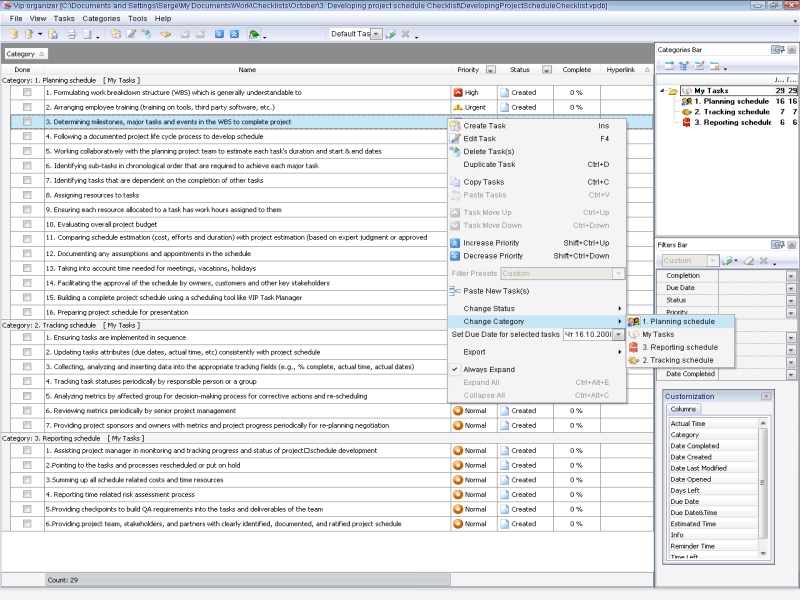 Project scheduling is a process that states how to manage time and resources to accomplish work. Use a scheduling software tool (VIP Task Manager is recommended) and t his developing project schedule checklist to plan and track the schedule of your project
