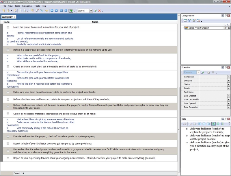 This School Project Checklist will be helpful to all students involved into examinational projects, whether in school or college, as it explains a basic action plan on how to get engaged into the project and conduct its work properly. With a help of this checklist you will know how to collaborate with your classmates and facilitators to get the best rates.   School Project Checklist