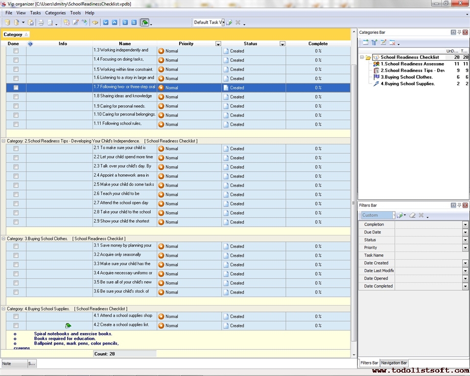 The following School Readiness Checklist will help parents get their children prepared for school. The checklist includes a series of school readiness ideas for buying school clothes and supplies, etc. School Readiness Checklist