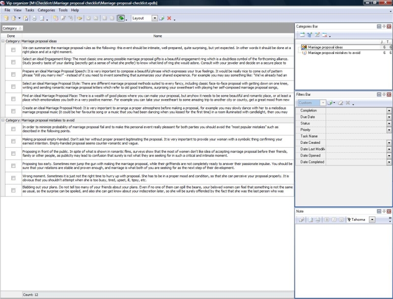 This marriage proposal checklist explains what you need to prepare in order of planning an ideal engagement proposal. This is a very significant and exciting moment in a life of every couple, as it finalizes earlier periods of relationships and drives them to a new stage leading to actual wedding. This marriage proposal checklist is a step-by-step list of recommendations giving you a marriage proposal advice on selecting engagement ring, composing proposal speech, etc.