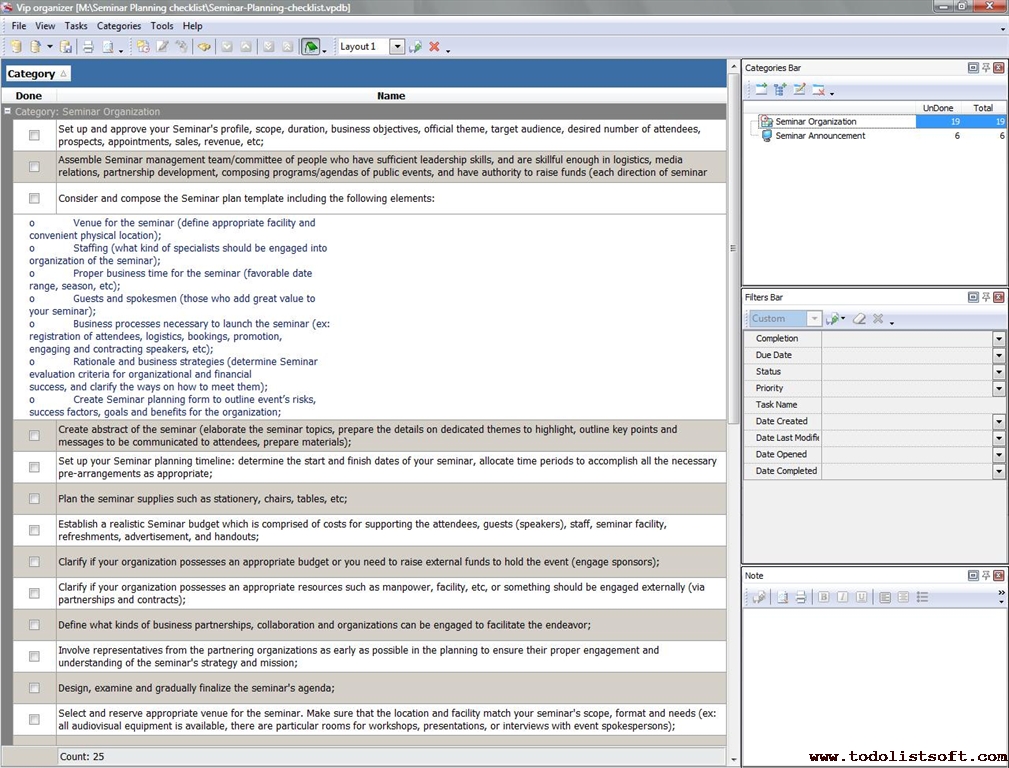 This Seminar planning checklist is composed to help and guide administrative specialists on organization of any seminars. This universal Seminar planning checklist works as an effective Seminar planning guide that comprises a big number of items to consider and effectuate in order of arranging a well-planned event.