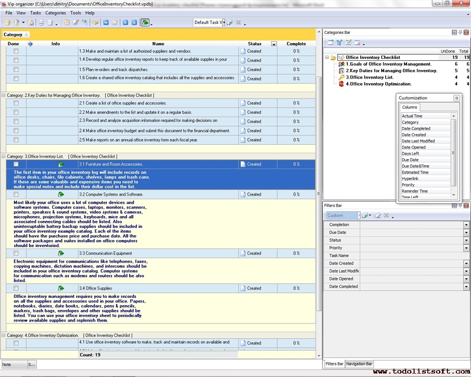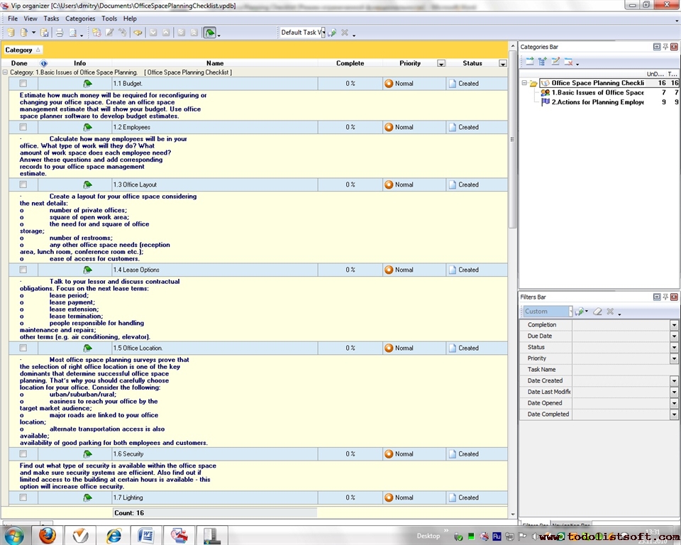 It is important to develop and implement an office organization strategy that helps re-organize your workplace at the office of your company. The given below office organization checklist is designed to show how your office workplace can be organized in order to maximize your productivity and reduce an amount of time wasting.