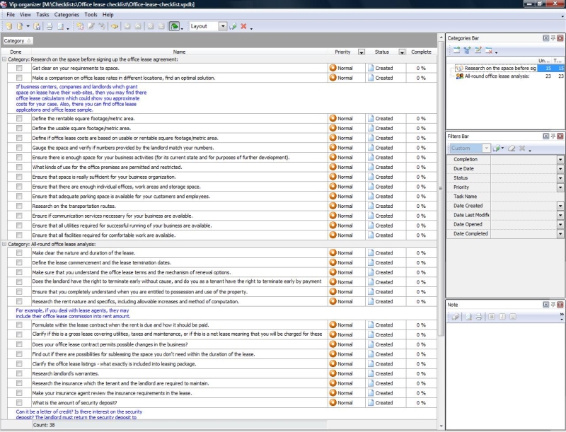 This office lease checklist consists of items which should be considered when you want to lease a space for your business. This office lease checklist is not a documentary office lease agreement template, but rather a listing of recommendations to study when selecting an appropriate office, conducting office lease negotiations, and finally things to include into office lease agreement.