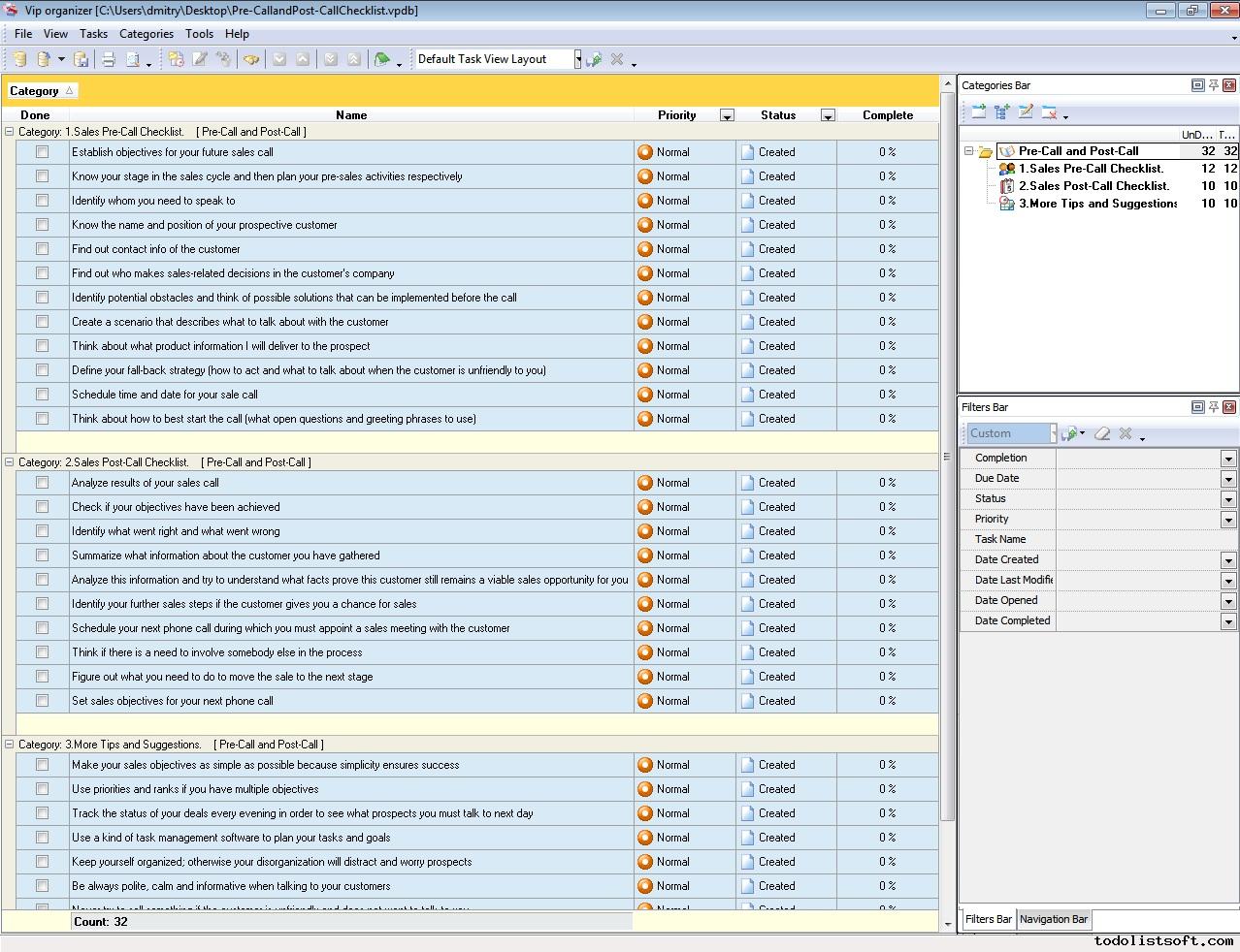 This Pre-Call and Post-Call Checklist is designed for salespeople to help them achieve better sales call results. It includes a range of tips and recommendations that describe how to best start and finish a sales call and what to talk about with target customers during the call. You can use the checklist in planning your sales call tasks.