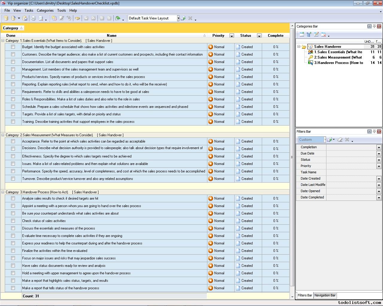 The following 30-60-90 Day Sales Plan Checklist is designed for people who have been just appointed to the role of sales representative. The checklist explains what tasks a new sales rep needs to do during 30, 60 and 90 days of the assignment. It is best used with VIP Organizer software.