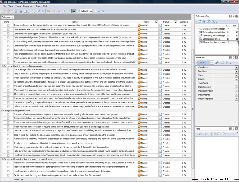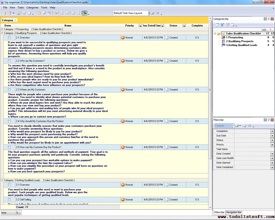 In this Sales Opportunity Checklist we describe a 3-step approach to identifying, analyzing and developing business drivers and leads. The checklist is designed for specialists involved in sales forecasting and performance analysis. It is best used with VIP Organizer software.