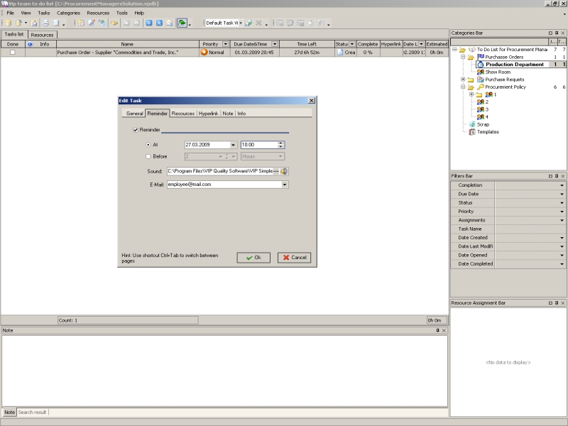 Task procrastinations and delays are inadmissible within the workflow of Procurement Department. The manager should care of timely deliveries, appropriate shipping dates and good task performance of the procurement staff members. In task management software, each task has the column “Due Date& Time”. When obtaining a new purchase request, the procurement manager sets Due Date for appropriate task. The column “Time Left” shows within what time period this order should be fulfilled. To avoid missed events and delays, the manager can set up reminders per task so that the assigned employee will get a pop-window or an email message. |