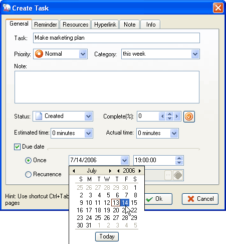 If you want to schedule a recurring task (ex. the one that occurs each Monday or first week of the month), you should activate Due Date box and select radio button Recurrence.