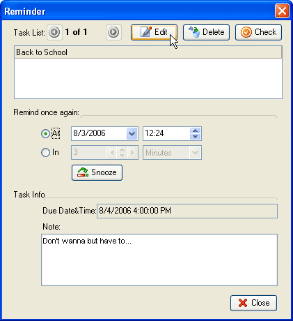Popup desktop message shows the task info and allows you to edit, delete and check the task within Reminder window. You can postpone the alarm for a certain time period by Snooze or clear the reminder by Close button. |